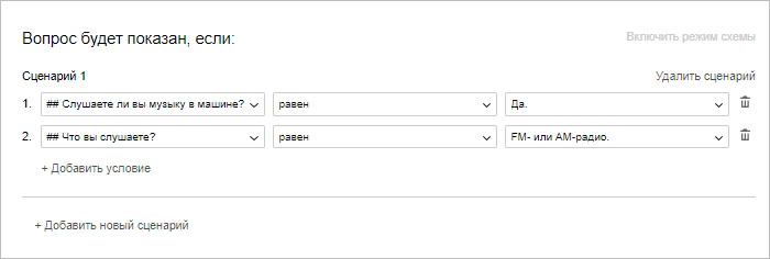 Вам нужно выделить группу людей, которая уже слушает радио. В режиме сценария вопрос «Какое радио вы предпочитаете?» будет показан пользователям, которые ответят «Да» на вопрос «Слушаете ли вы музыку в машине?» и выберут ответ «FM- или AM-радио» на вопрос «Что вы слушаете?».
