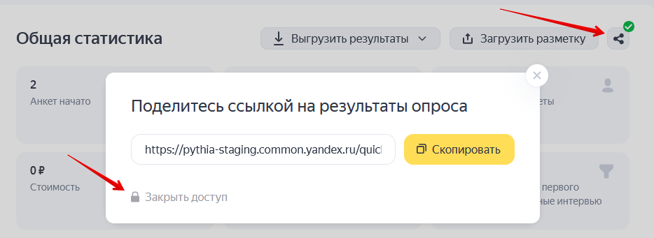 в этом окне, поделиться статистикой с пользователями, у кого нет доступа к опросу, не получится.